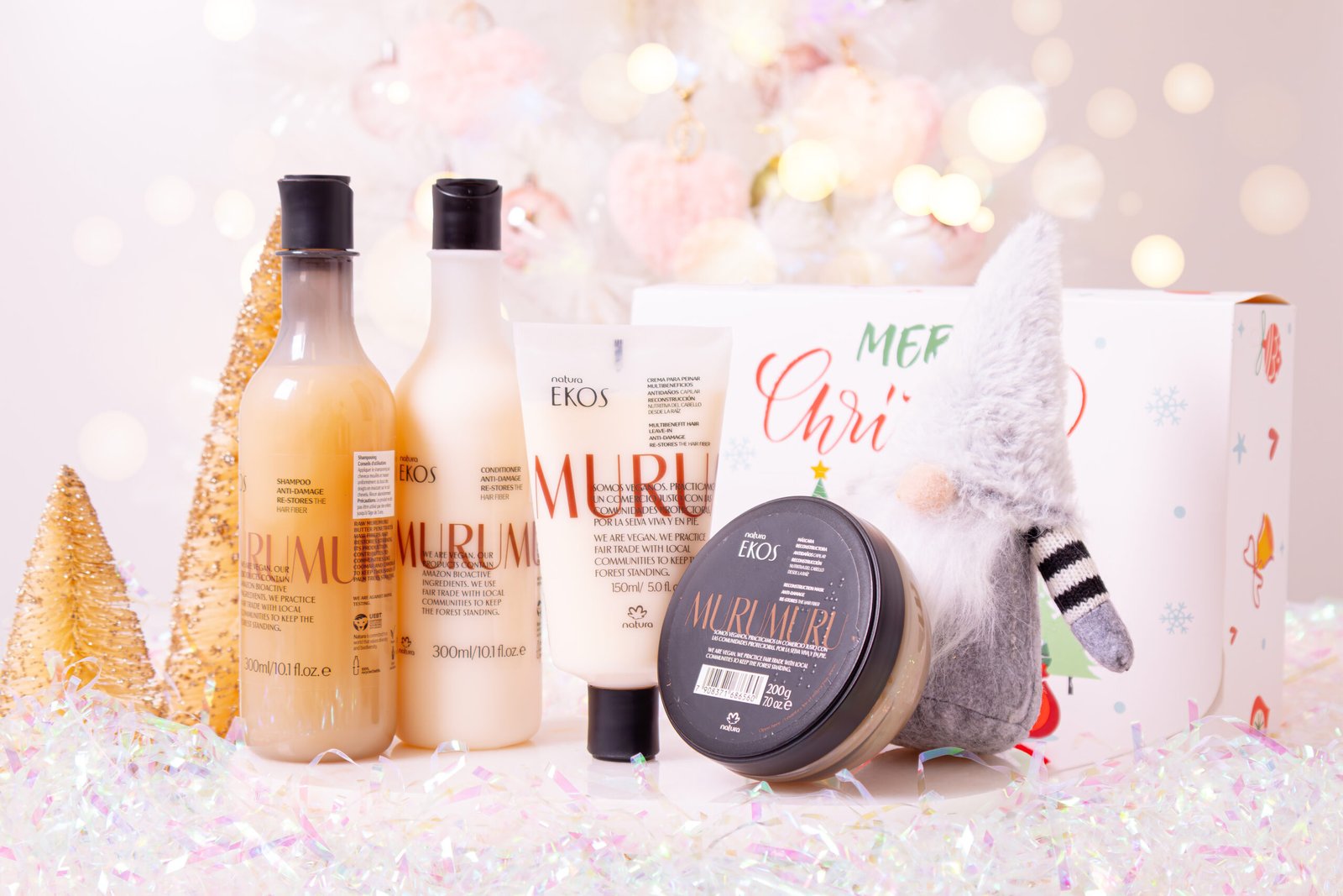 O Kit de Presente para Cabelos com Murumuru é perfeito para restaurar cabelos danificados, repor nutrientes e devolver a elasticidade natural. O murumuru é rico em manteigas e lipídios que reparam profundamente, selam as cutículas e deixam o cabelo mais forte, macio e incrivelmente brilhante. Uma rotina completa para revitalizar seus fios e deixá-los deslumbrantes neste fim de ano!